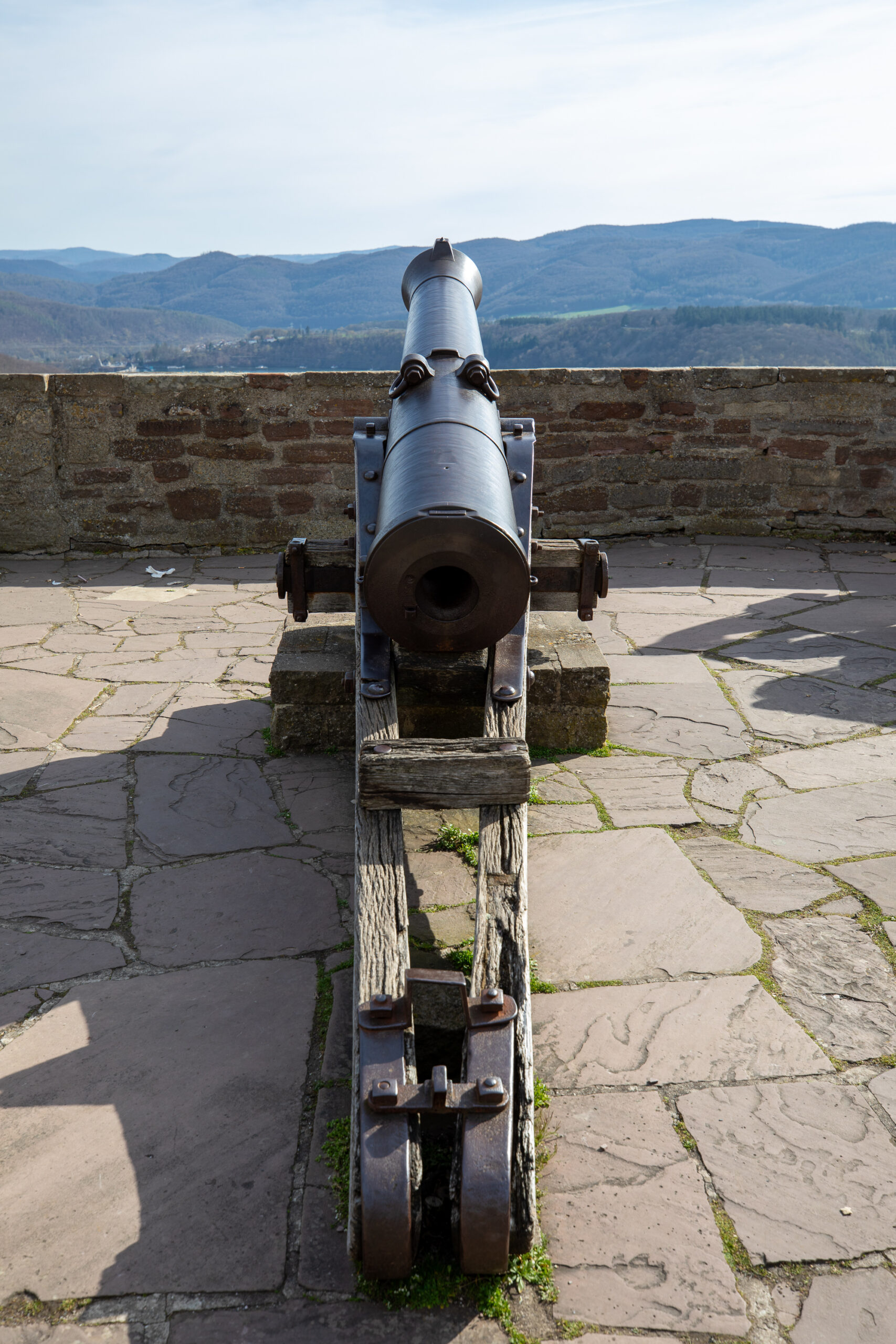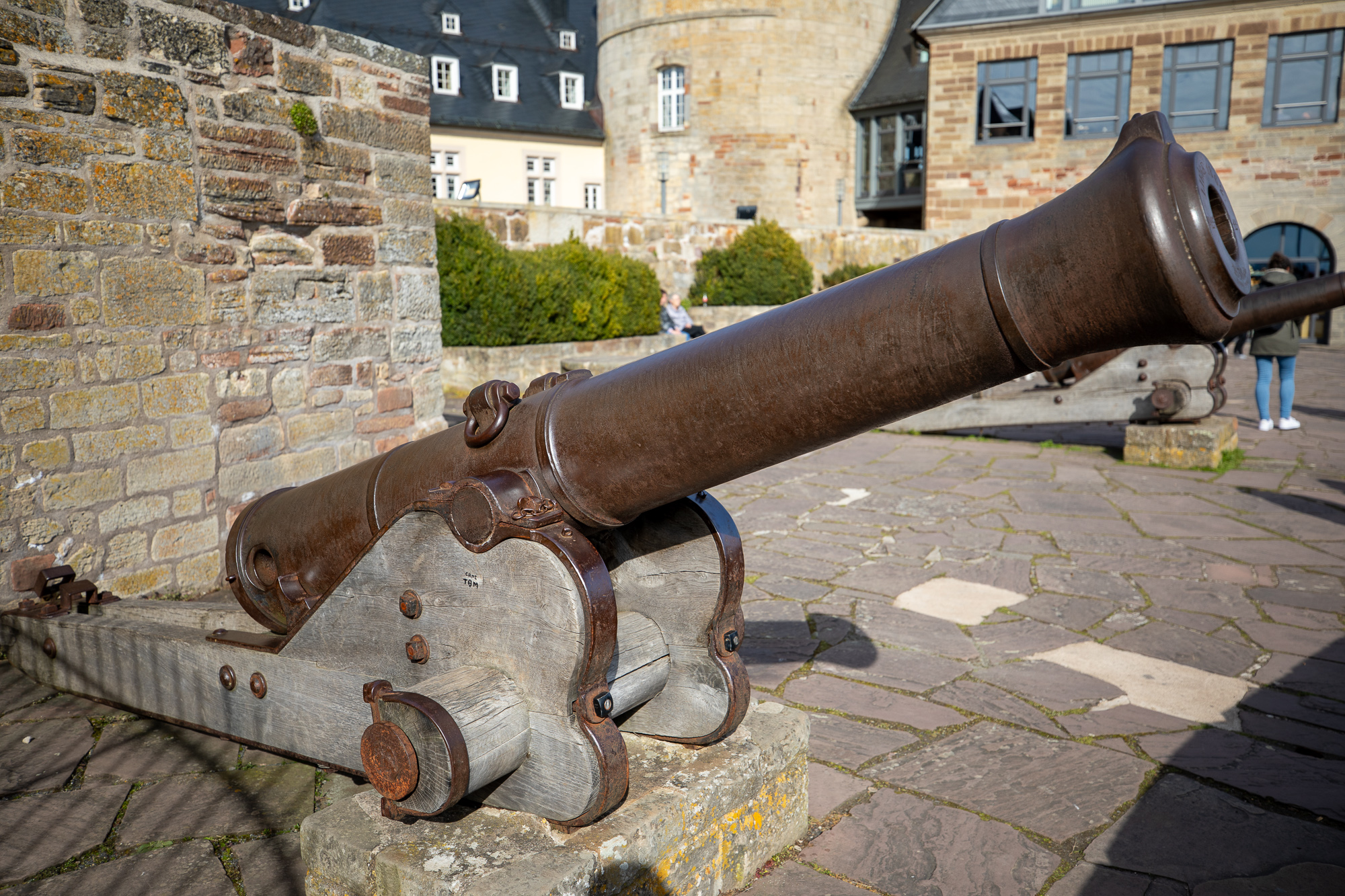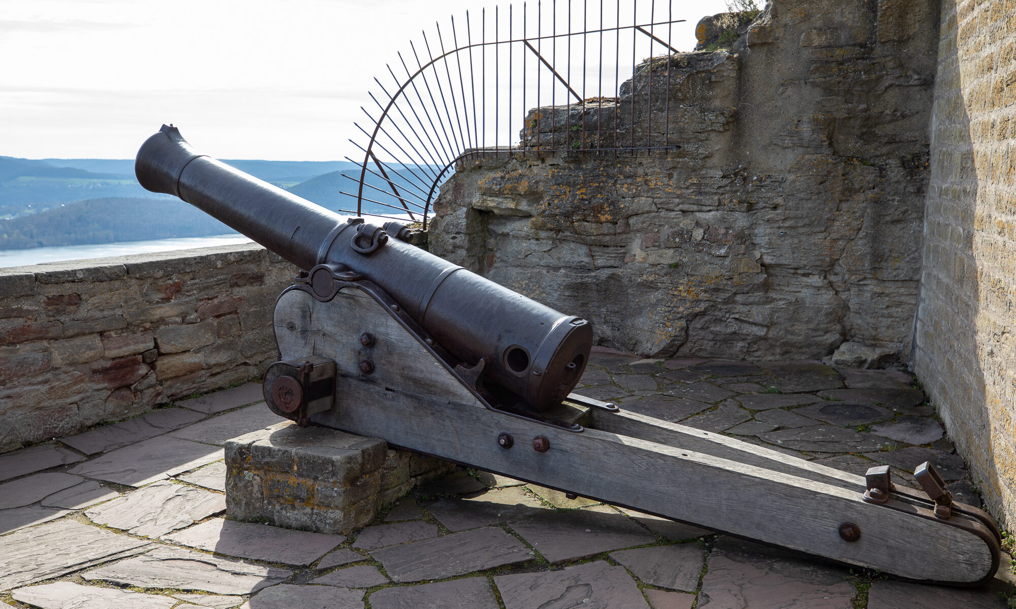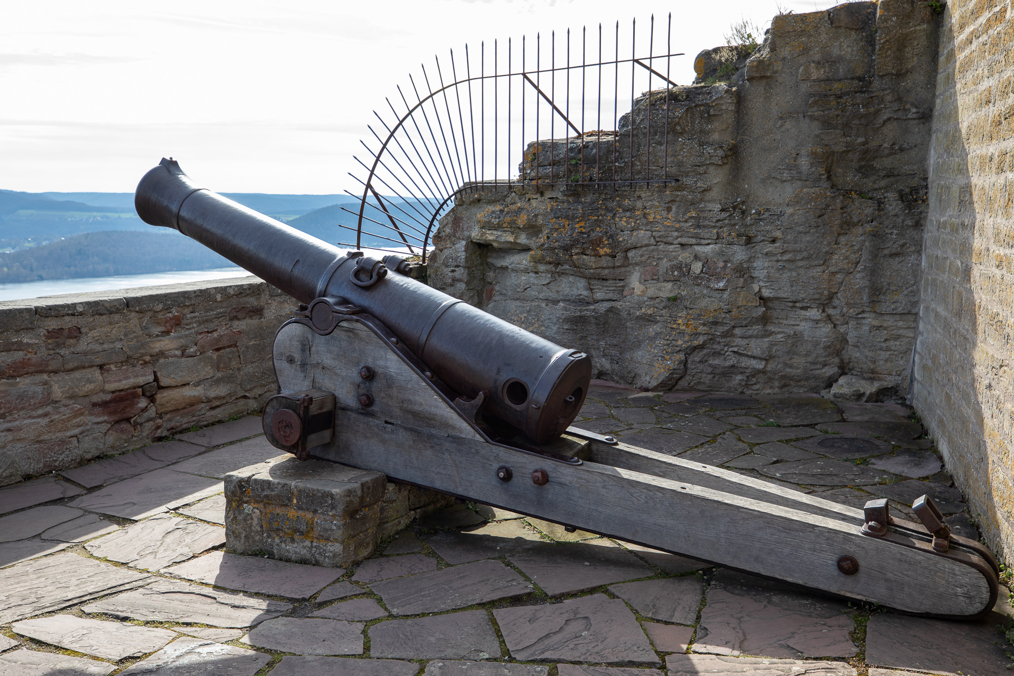 High above the artificial Eder-Lake in Hessia sits Schloss Waldeck, a castle that dates back to the 12th century. On the terrace are two unusual cannon on display.