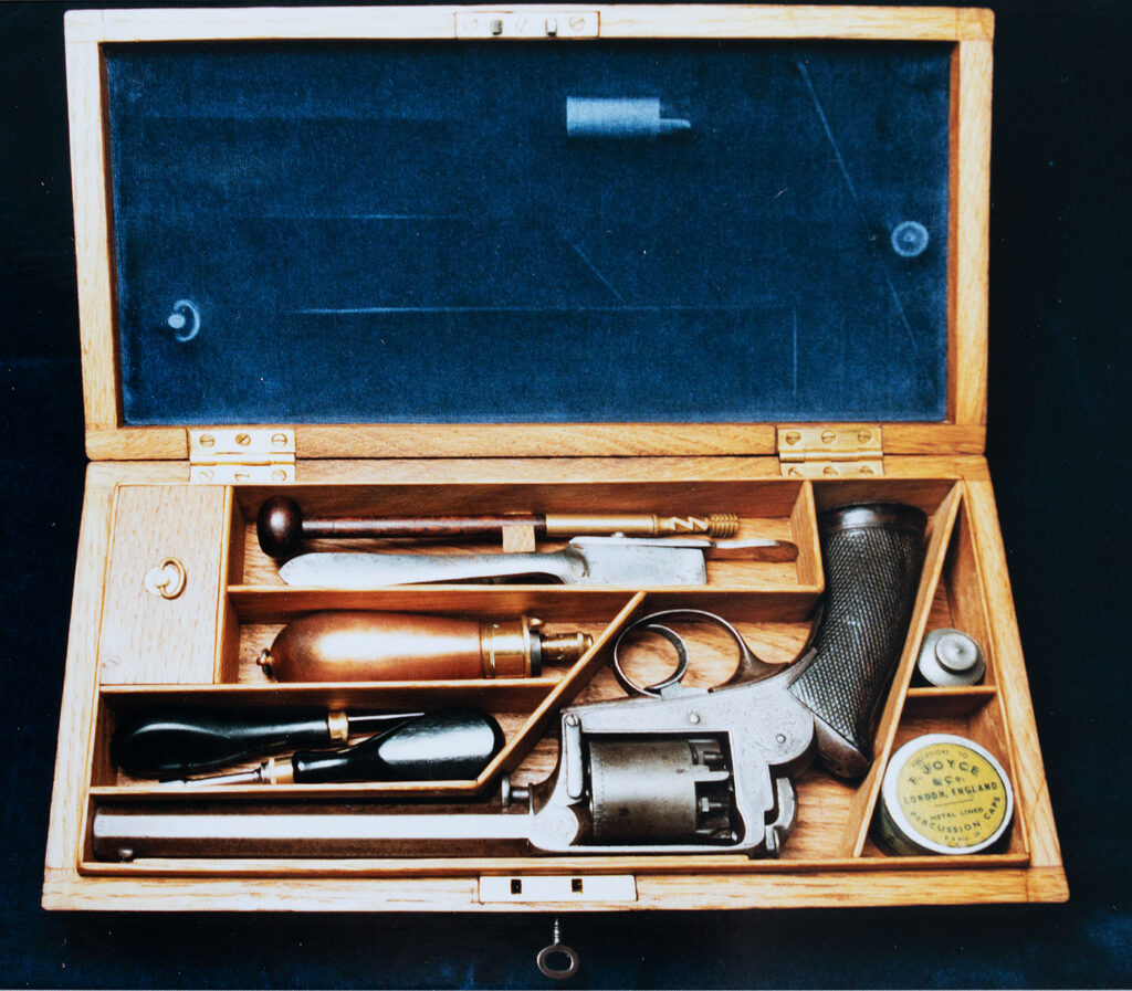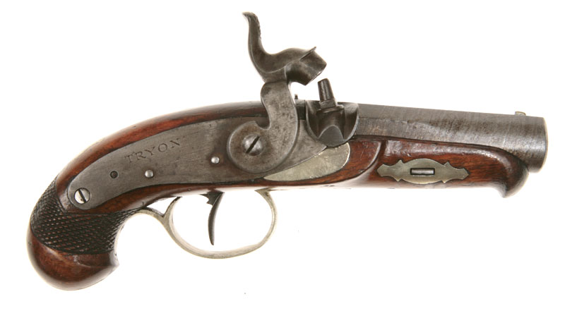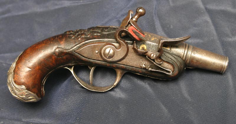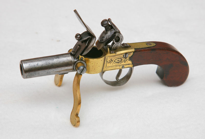 Firearms Cased percussion revolver by Wilkinson&Son. Item B220. 1.700EUR. British blunderbuss flintlock pistol with spring-bayonet, made by Bass. Item B096. 4.000EUR. Flintlock tinderlighter. Item B102. 900 EUR. Under-hammer percussion pistol with Bowie-blade bajonet. Item B108. 850EUR. Percussion Derringer by Tryon. Item B083. 1.600EUR. Victorian Royal Navy Sea Service Pistol, dated 1855. Item B119. 1.200EUR. A pair of French blunderbuss pocket pistols. Item B095. 4.200EUR. An 18th century coach blunderbuss. Item F163. 2.300EUR. French Louis XV pocket pistol by Bourlier L’aine. Item B024. 4.200EUR.