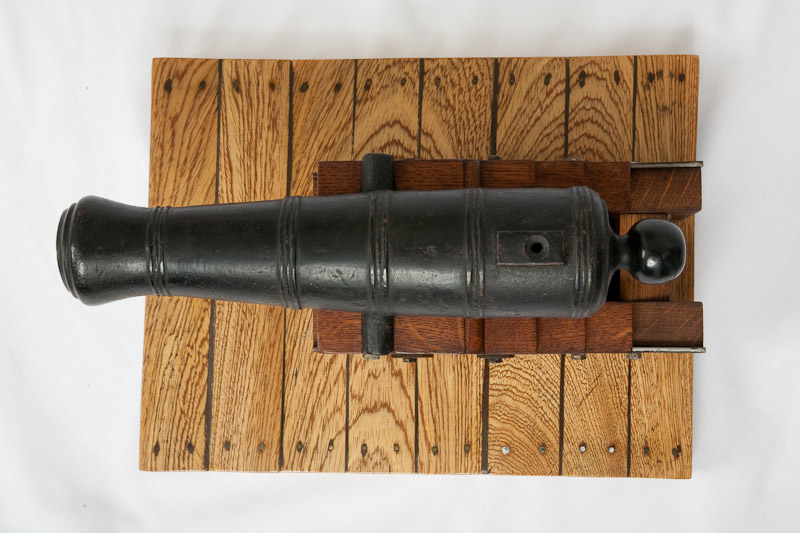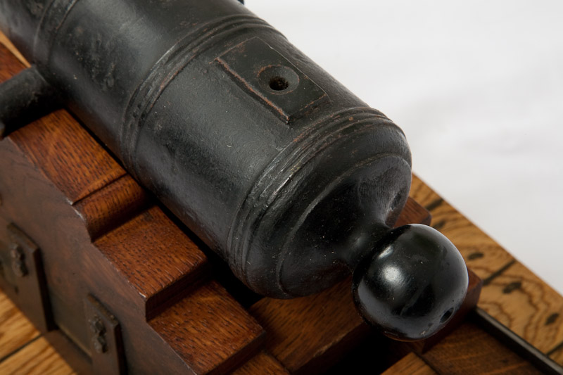 Iron model cannon on fortress carriage An antique iron cannon barrel with sectioned reinforcement rings on a fortress carriage by Willy Schroeter with a sliding mechanism to dampen the recoil of the shot. The cannon rotates 360° on its deck. Barrel length 28,5cm, calibre 2cm. Fireable.Item H227. 500EUR.