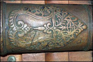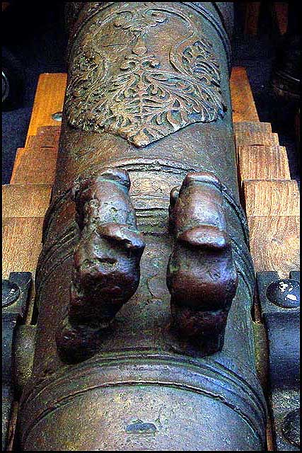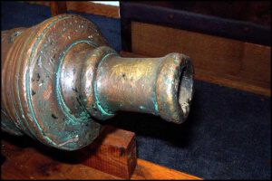 A very interesting mid-size bronze cannon of Indonesian production for European East India merchants, late 16th / early 17th century. The barrel displays a rare mix of European and Asian elements. The overall shape conforms with 16th century Portugese ordnance, but the coat of arms is purely decorative, and the rear is formed like a Lantaka’s, to take up a wooden grip.
