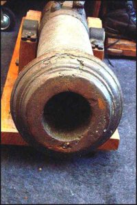 Length of barrel: 115cm (ca. 45″), weight incl. carriage ca. 85kg (187lbs.). Calibre 1/2 lb. The carriage was made of elm wood by Willy Schroeter.
