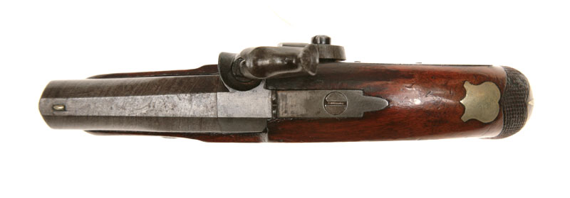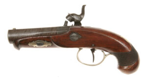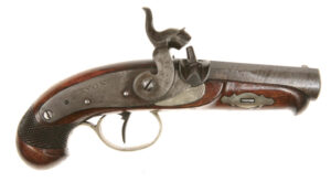 A handsome 19th century Percussion Derringer. Six centimeter long Damascus-barrel with seven grooves at the muzzle. Calibre 11mm. Lockplate signed “TRYON”. Length overall 16,5cm. George W. Tryon and his descendants manufactured arms in Philadelphia from 1811.